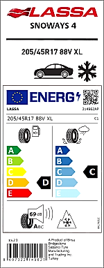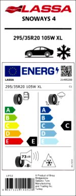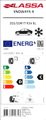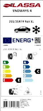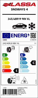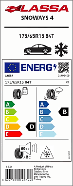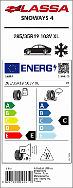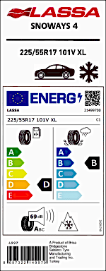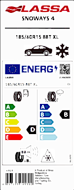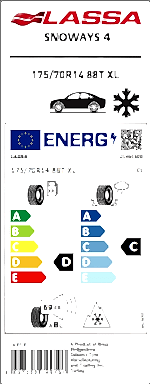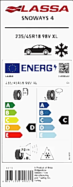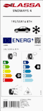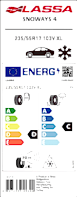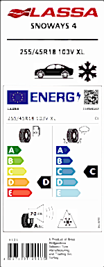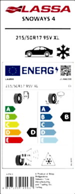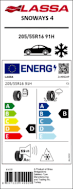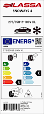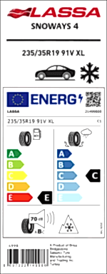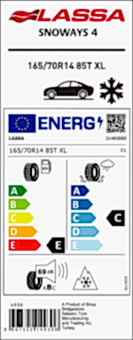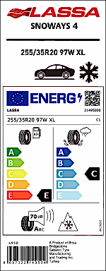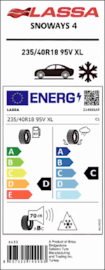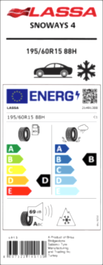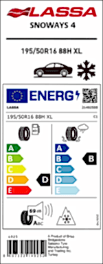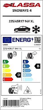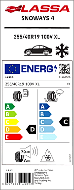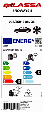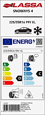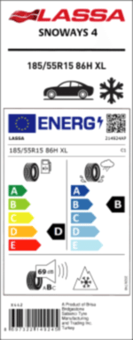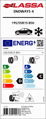 Lassa Snoways 4, AB standartlarına uygun lastik etiketiyle yakıt verimliliği, ıslak zemin tutunması ve dış gürültü seviyesi hakkında net bilgiler sunar. Optimize edilmiş hamur bileşimi ve sırt deseni sayesinde yakıt tüketimini azaltırken güvenlikten ödün vermez. C sınıfı yakıt verimliliği, B sınıfı ıslak zemin tutunması ve 72 dB dış gürültü seviyesi ile Snoways 4, hem ekonomik hem de konforlu bir sürüş deneyimi sağlar.